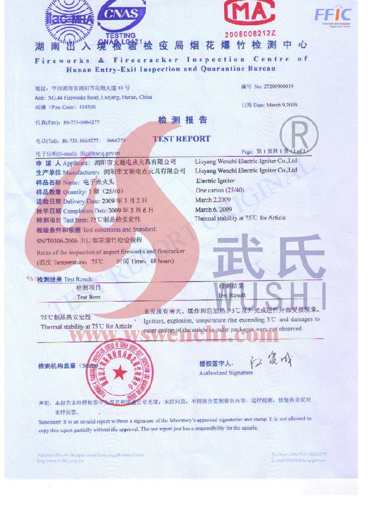 瀏陽市文馳電點火具有限公司(原培文電子點火器材廠),創建于1998年,是一家專業從事研制銷售電子點火產品的民營科技企業,是我國第1枚煙花用電點火頭生產者,是《煙花爆竹電點火頭國標》牽頭起草單位。公司位于中國“煙花之鄉”湖南省瀏陽市,地理位置優越,交通便利?! ? 我公司研制的對象是用電能引燃火藥、做機械功等預定功能的一次性使用的元件或裝置,包括電點火頭(英文名ElectricMatch or Electric Igniter,中文俗稱“電火柴”或“電發火頭”)、電點火管和延期電點火管;我們估且在以后的產品技術欄中將我們研究的產品統稱為電點火具,將電點火器看成是用于提供和控制供給電點火元件點火的電能器材;我們研究的電點火橋路有橋絲式、無橋絲···